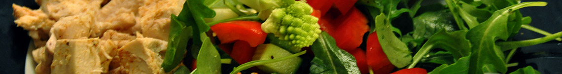 Pieczona pierś z kurczaka, pomidory koktajlowe, ogórek, ser mozzarella, brokuły, kukurydza, papryka, prażona mieszanka ziaren (dynia, słonecznik, sezam), podane na mieszance sałat z sosem ogrodowym i udekorowane rukolą 470 g. -